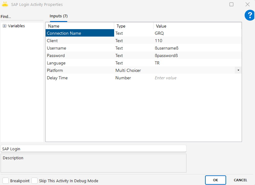 - Platform: İşlemin hangi SAP platformu üzerinde çalıştırılacağını belirtir. Bu seçim, robotun doğru ortamda işlem başlatmasını sağlar.