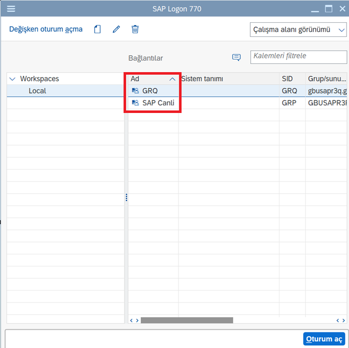 Connection Name alanına SAP uygulaması açıldığında ilk çıkan penceredeki bağlantılardan login olmak istediğiniz bağlantı ismi yazılması gerekmektedir. Client bilgisini ise bağlantıya çift tıkladıktan sonra açılan Login sayfasında bulabilirsiniz.