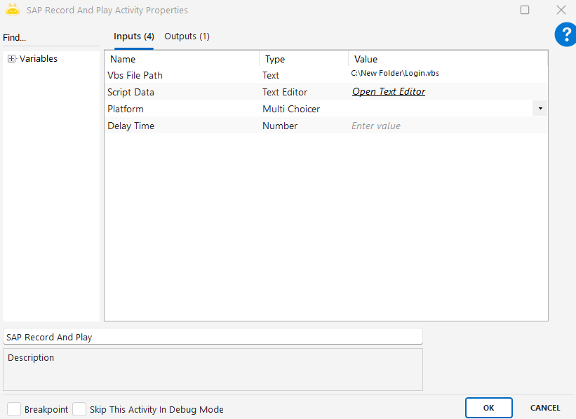 - Vbs File Path: SAP üzerinden daha önce oluşturulmuş .vbs uzantılı script dosyasının tam dosya yoludur. Kayıtlı script dosyasını doğrudan çalıştırmak için kullanılır.Örnek: C:\Scripts\Login.vbs