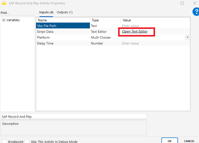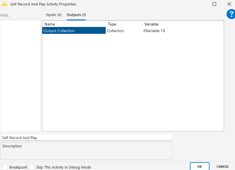Kayıt tamamlandıktan sonra ilgili script içerisindeki alanlara değişken atama işlemi yapılabilmekte ve SAP’deki tıklanan kutucuk, metin, bar vb. alanları Outputs alanından collection değişkeni içerine satır olarak eklenebilmektedir.