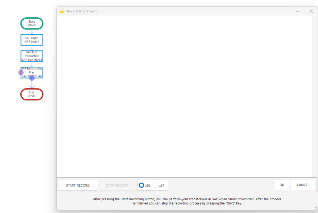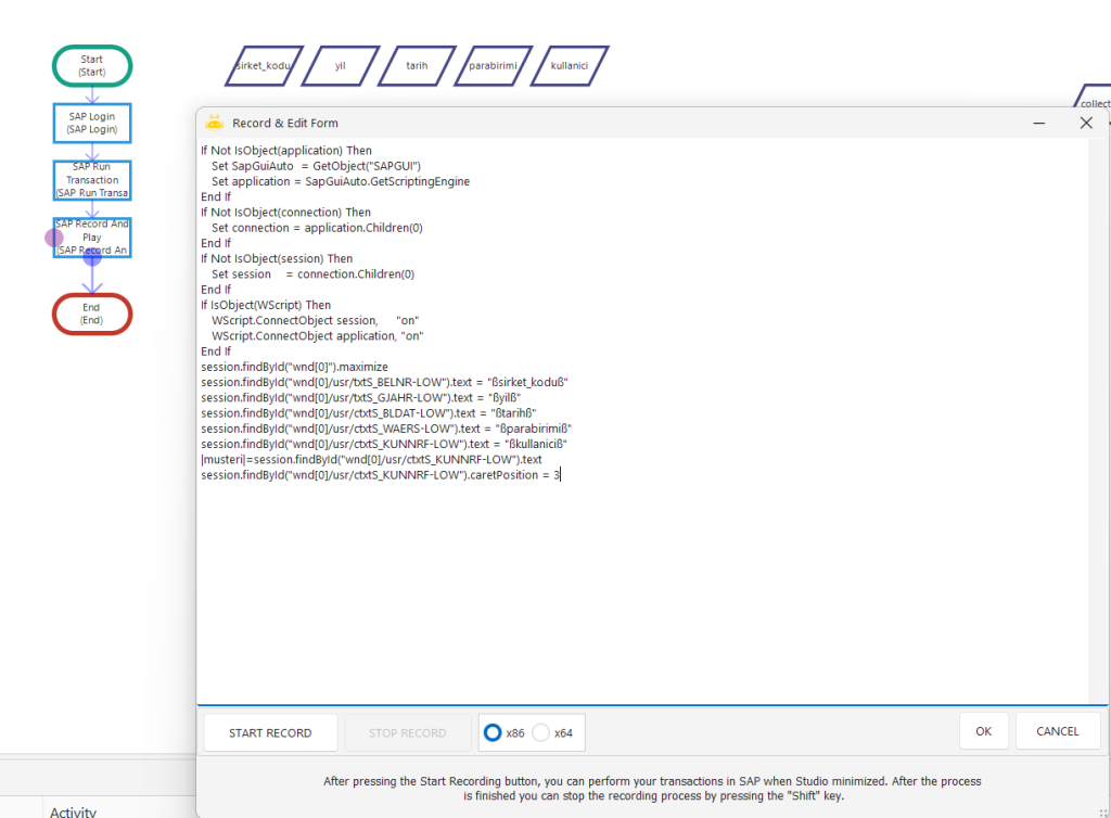 SAP Record And Play aktivitesi, SAP ekranlarında gerçekleştirilen kullanıcı işlemlerini otomatik olarak kaydedip, sonrasında bu işlemleri aynı şekilde tekrar oynatmaya (playback) olanak tanır. Aktivite, SAP’nin “Script Recording and Playback” özelliğini kullanarak, otomasyon sürecine kullanıcı hareketlerini dahil eder.