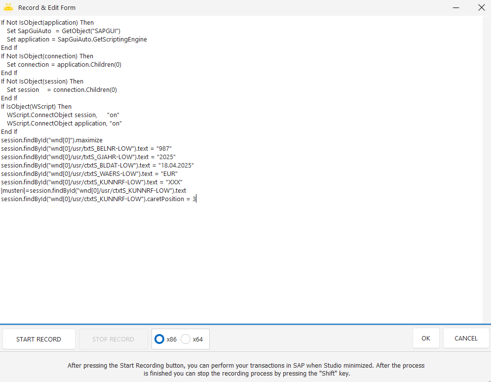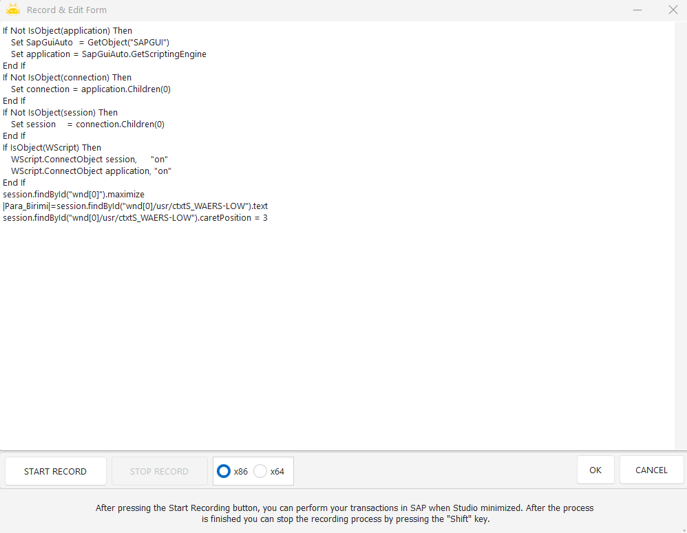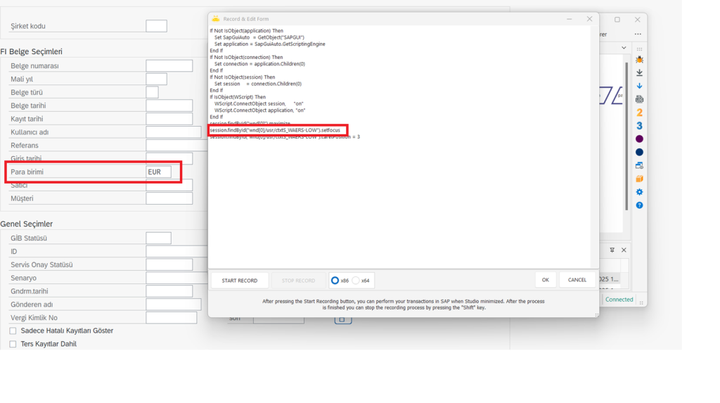 SAP ekranında “EUR” (örneğin para birimi alanı) olarak görünen bir kutucuğa odaklanmak ve bu alana ait script’i kayıt altına almak için:SAP Record And Play özelliği ile kayıt başlatılır.
