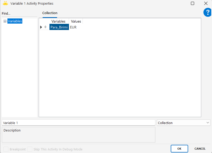 - Burada “ßparabirimiß” bir değişkeni temsil eder. RPA sürecinde bu alana atanacak değer, variable içerisinden otomatik olarak doldurulacaktır.