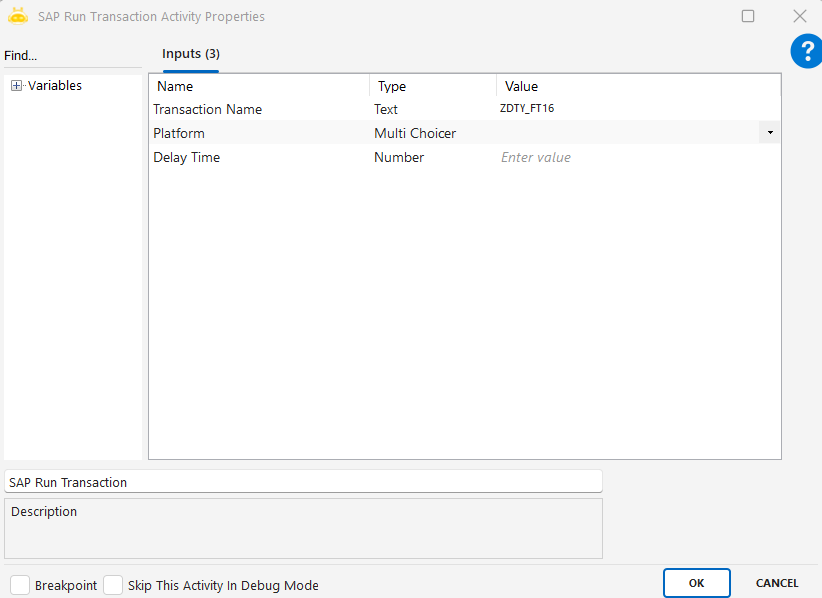 - Transaction Name: Çalıştırılmak istenen SAP işlem kodudur (örneğin: VA01, ME21N, FB60 gibi). Bu alana girilen TCode, SAP ekranında o işlemle ilgili ekranı açar.